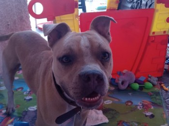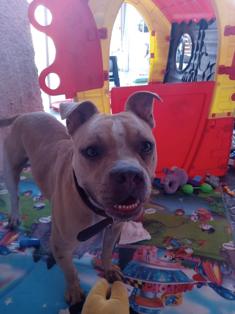 Somos un Programa de Sename. Hoy apareció un Pitbull en el pasaje que se encontraba desorientado y sediento. Posee Collar pero la placa no dice nada. Se comportó muy agresivo con otro perro que pasaba y ahora ingresa por entremedio de la reja hacia el int