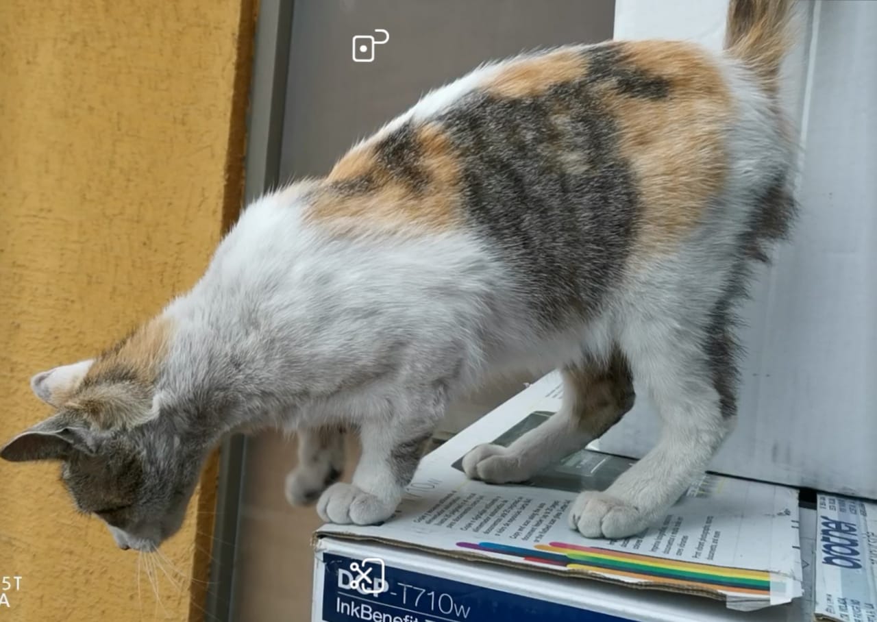 Gatita encontrada por población 21 de Mayo, al parecer está preñada, presenta heridas por peleas en su nariz y una de sus patas, tiene una oreja herida también, es pequeña de contextura, cariñosa, pero con miedo.