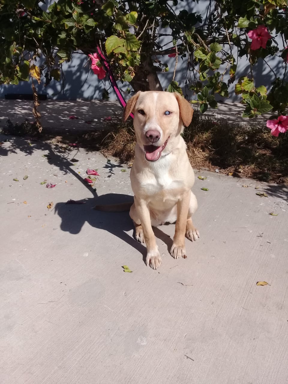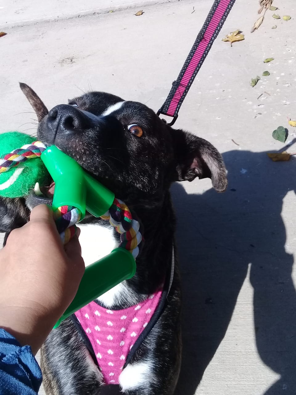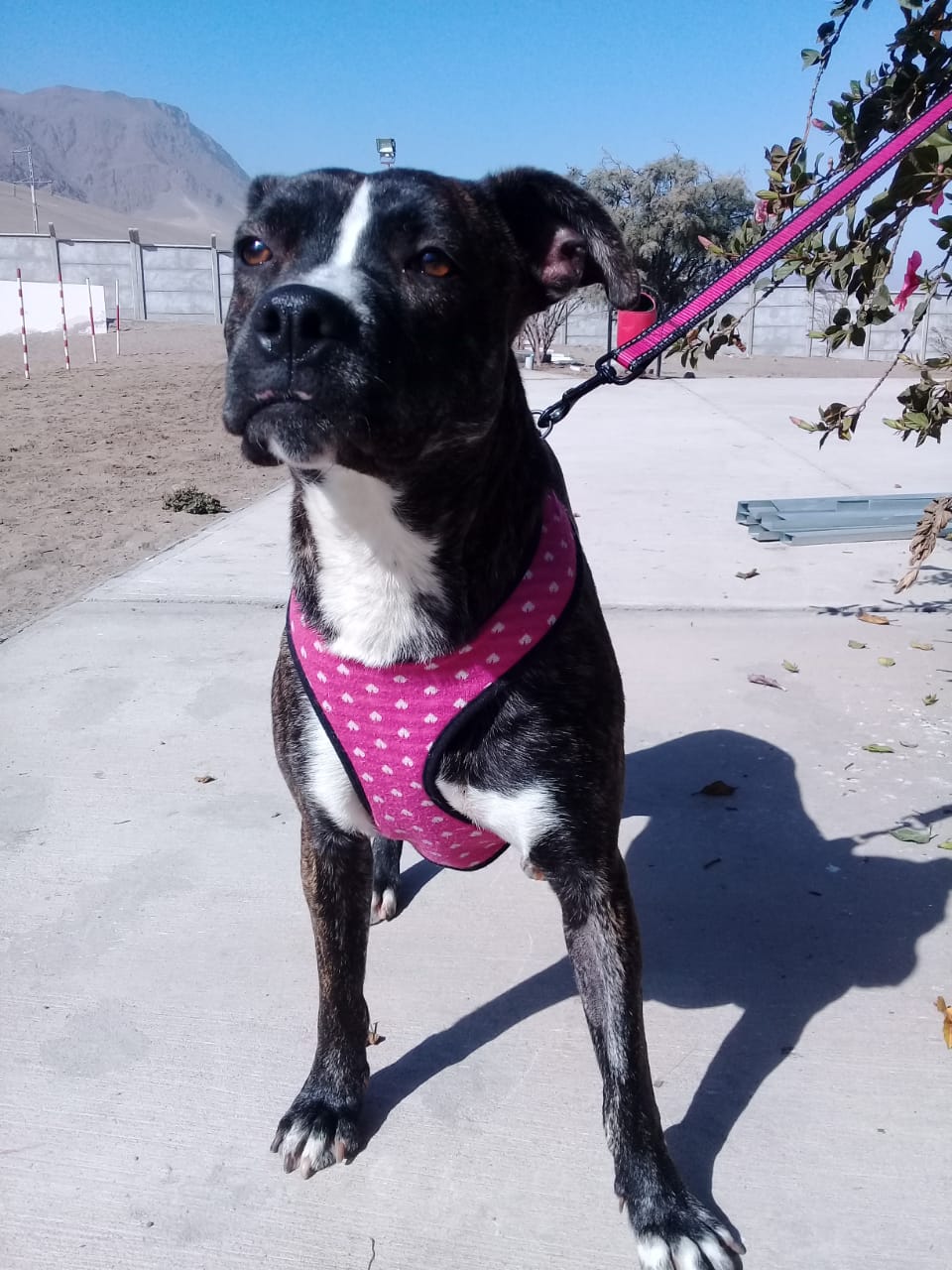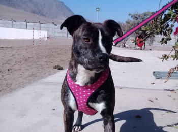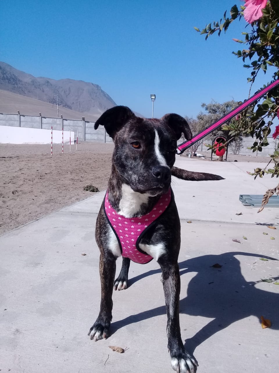 Hembra esterilizada de 2 años de edad aproximadamente, mestiza. Es muy juguetona, le encanta correr y jugar con pelotas. Es muy cariñosa con las personas pero territorial. Ideal para familias sin perritos. Ella fue abandonada en un colegio.