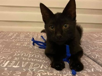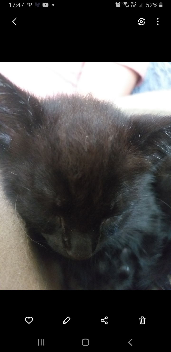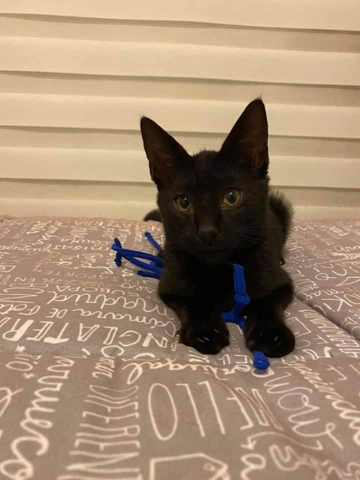 Se da en adopción gatito negro de aproximadamente 3 meses de vida encontrado en la vía pública. Se entrega con 2 bolsas de comida. Porfavor ayuda!! No podemos tenerlo.