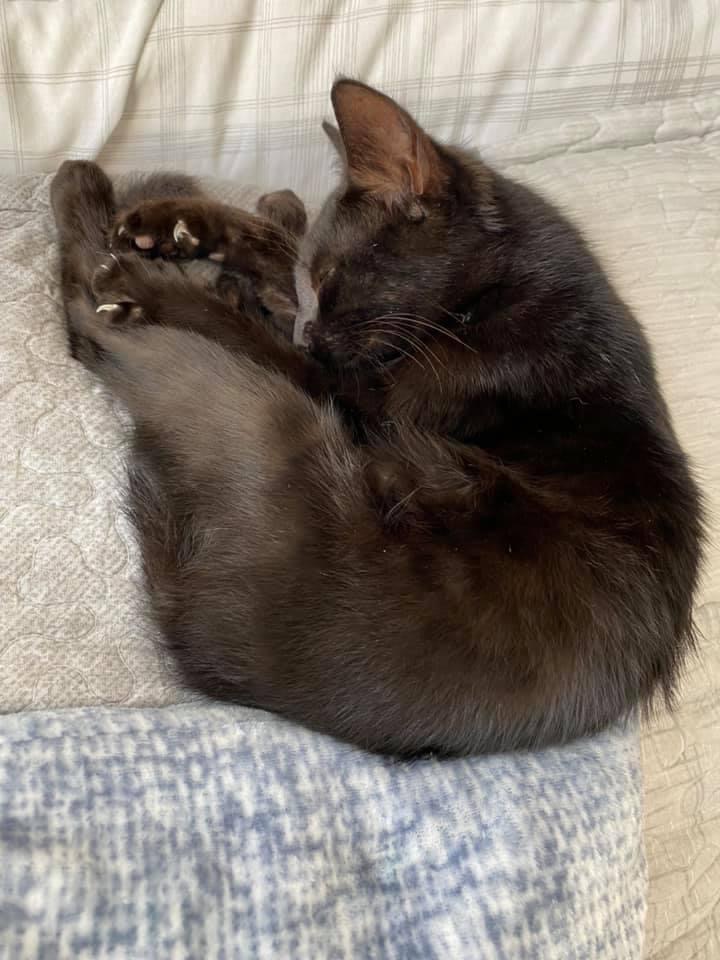 Fue abandonada fuera de nuestra casa, la hemos alimentado pero no podemos permitirnos otra mascota nos gustaria que quedara en un buen hogar, es negrita con ojos azules, se apega bastante a uno y maulla y ronronea bastantemente tierna