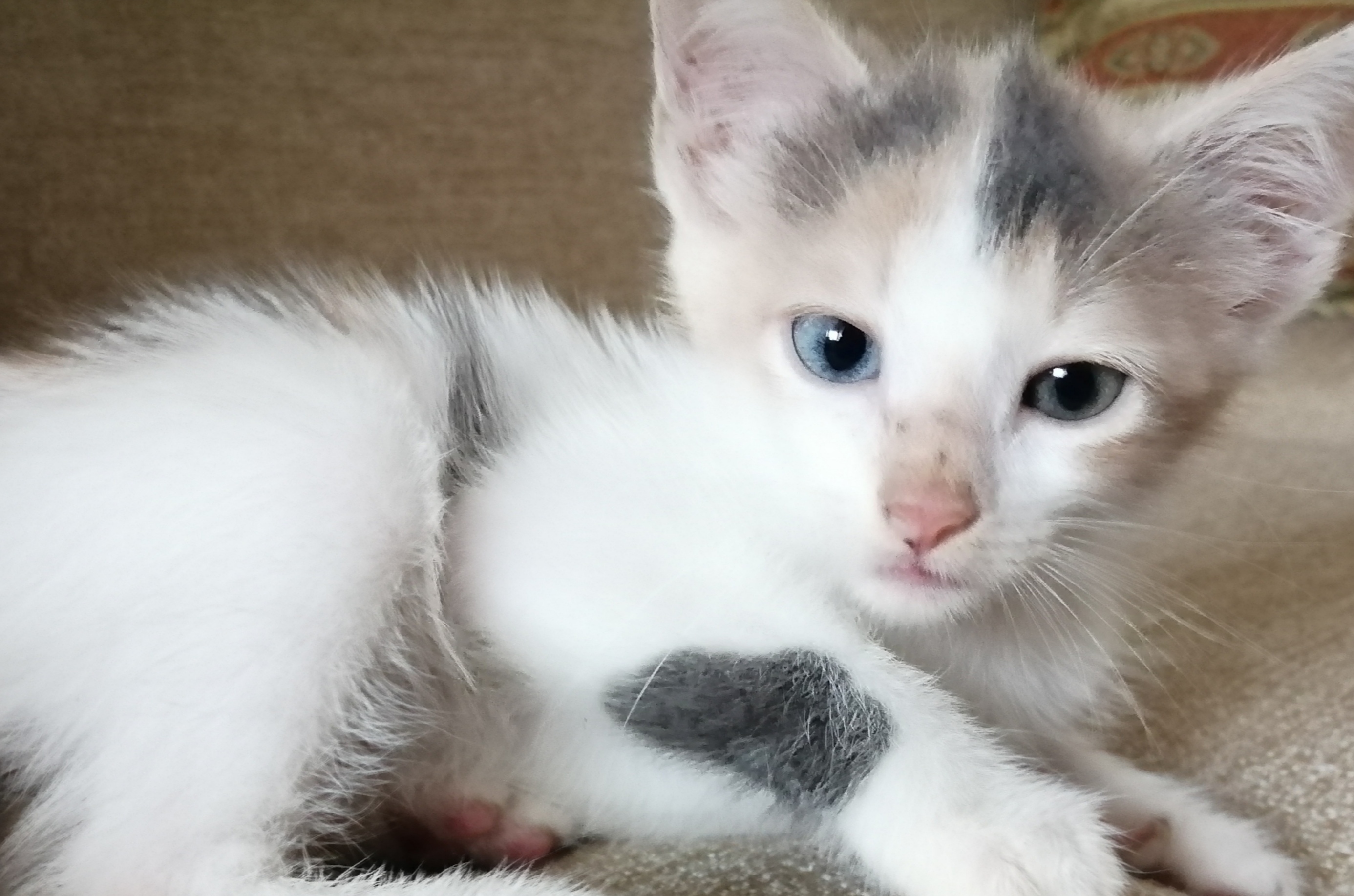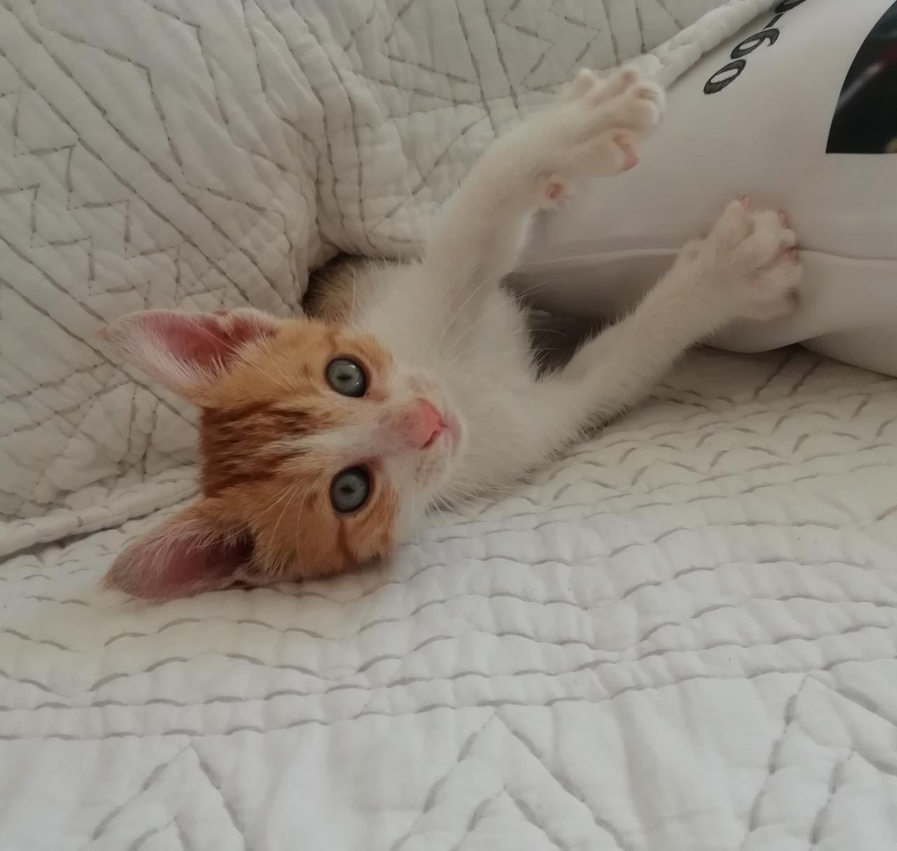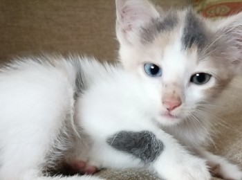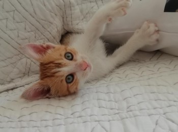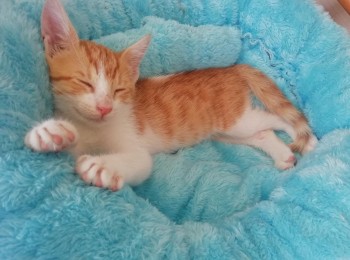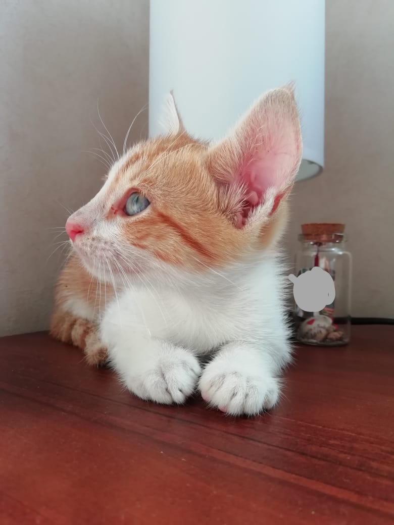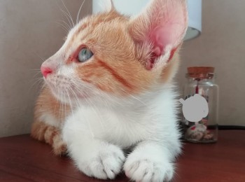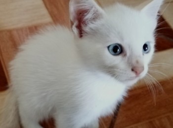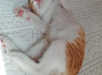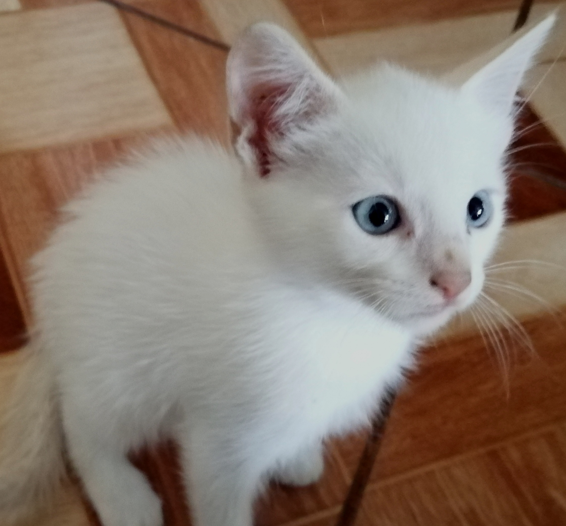 Gatito macho de 2 meses. Blanco con amarillo y ojos hermosos de color. Cariñoso y jugueton. Tiene la primera vacuna al día, la segunda se pone a inicios de abril. Tiene arenero, pala, cama, y platos de comida. Ya sabe hacer sus necesidades en el arenero.