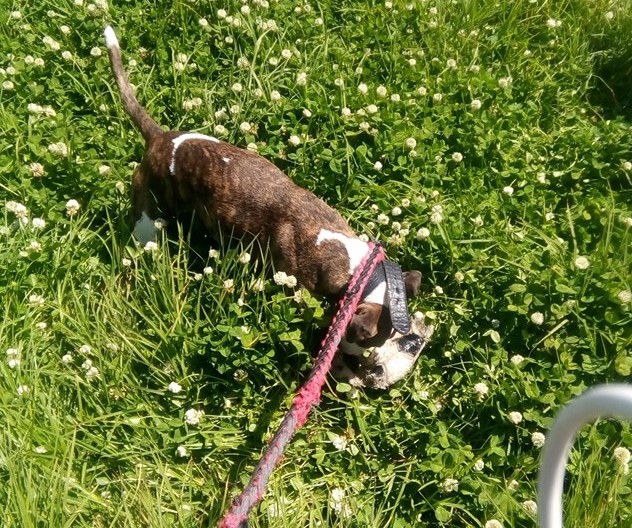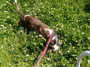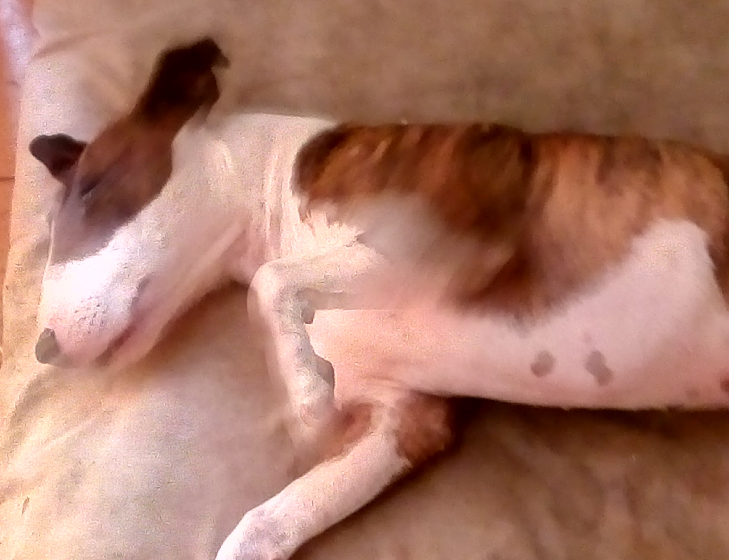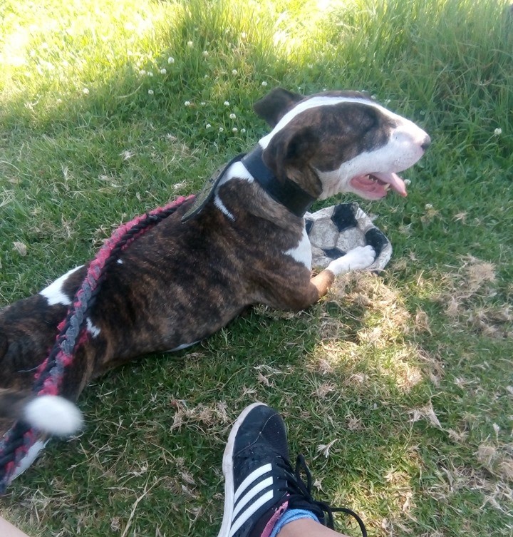 Su nombre es Akasha (Cobayita) bullterrier castrada, con chip y vacunas al dia, goza de excelente salud es tranquila y compañera con otras personas y le gusta pasear, no puede estar con otras mascotas y esto por esto que busca un nuevo hogar que la quiera