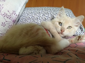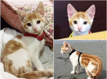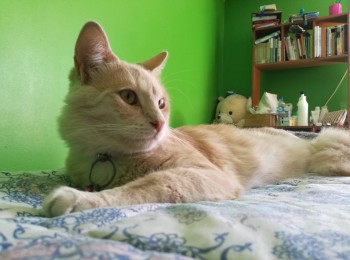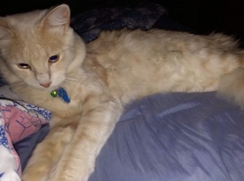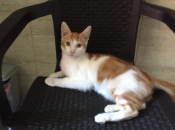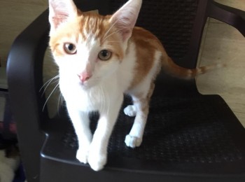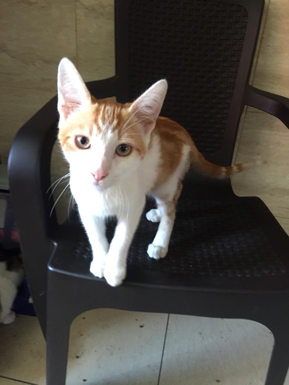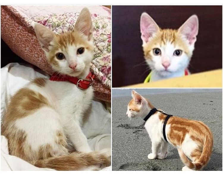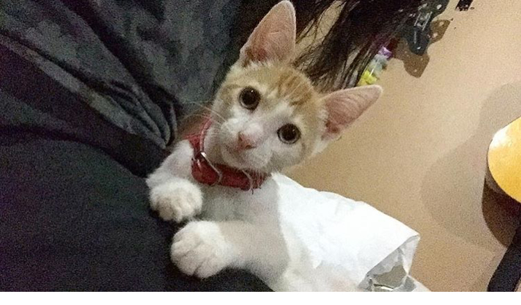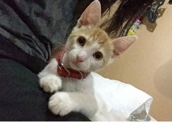 Gato macho pequeño, color blanco con amarillo, collar negro tipo pañoleta.