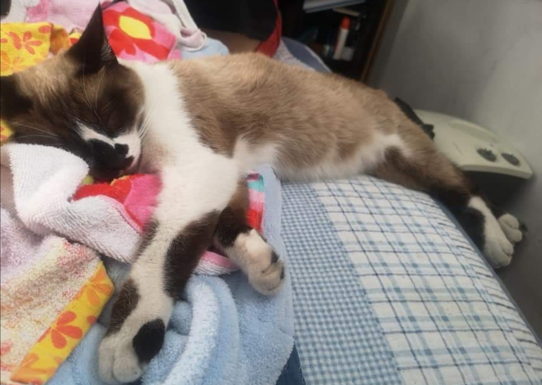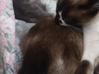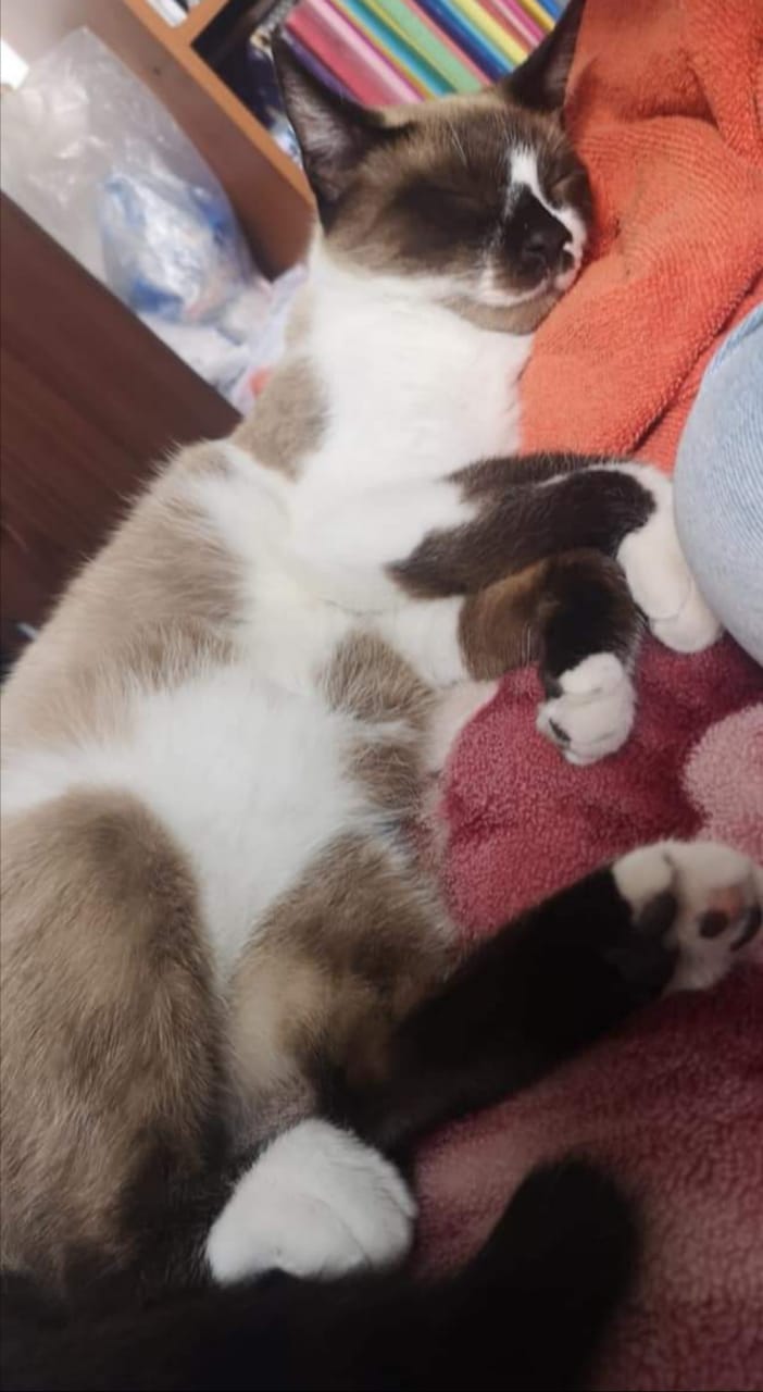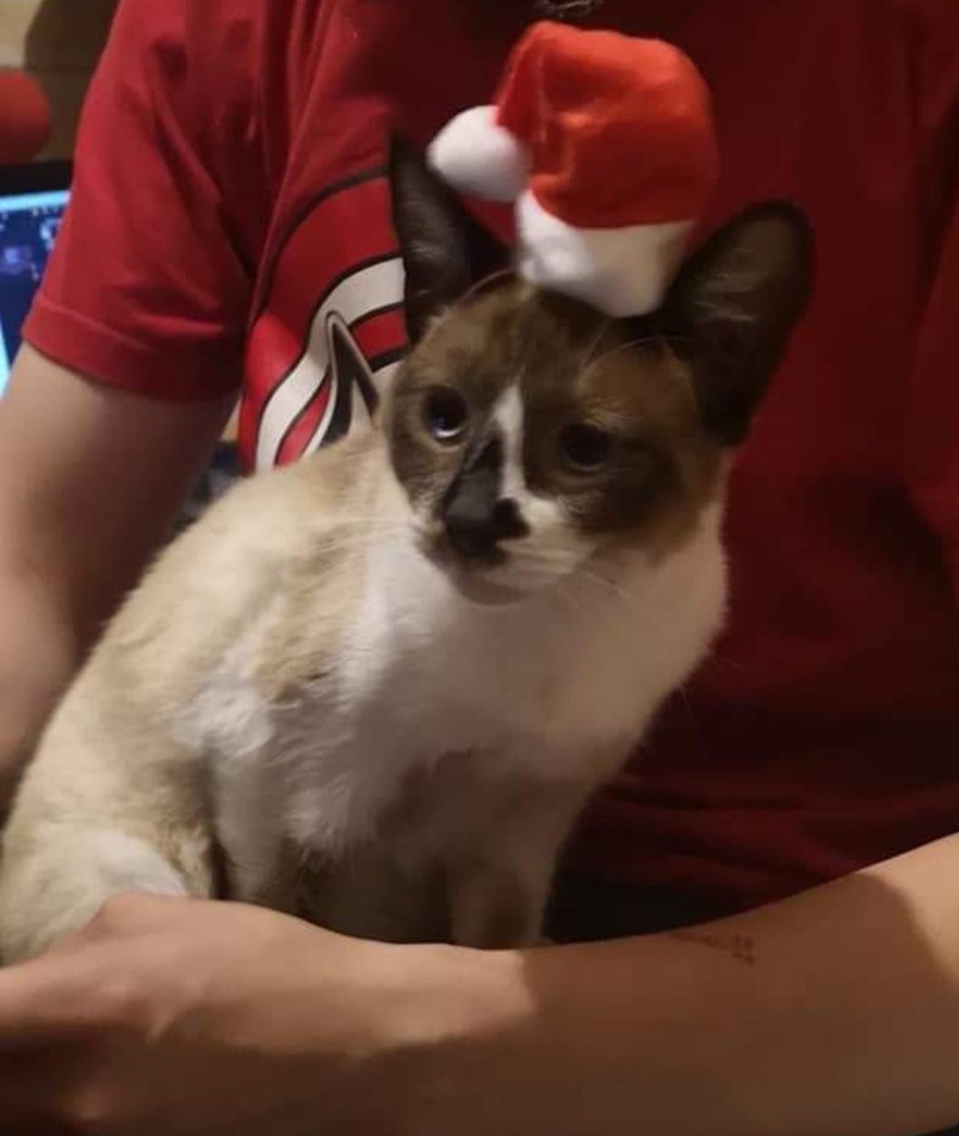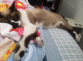 Es parecido a un siamés, tiene las orejas, nariz, cola y manchas en sus patitas negras, su cuerpo es blanco con beige.