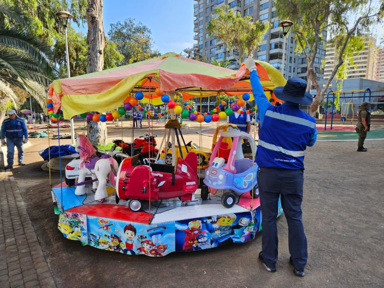 En el operativo que contó con la labor de Carabineros, DPR (Delegación Presidencial Regional), Subsecretaría de Prevención del Delito y las direcciones municipales de Inspección, Seguridad Ciudadana, Seguridad Pública y Aseo, se incautaron cuatro camas elásticas, dos juegos inflables y un juego mecánico (carrusel). “Este sector se caracteriza por ser el pulmón verde de Antofagasta (…) pero hay personas que abusan de esto porque viven de esto y tienen verdaderas empresas familiares y tienen juegos en el sector del Parque Croacia, Parque Los Eventos y aquí mismo en el Parque Brasil y esto significa un peligro para la salud e integridad de los niños (…) hay muchos juegos que están en muy malas condiciones poniendo en riesgo la vida de los niños”, enfatizó el alcalde Jonathan Velásquez Ramírez manifestó. | El resultado de este operativo son siete citaciones a tribunales por transgredir el artículo 7 de la Ordenanza Municipal N°3/2017 que refiere a la ocupación del espacio público con entorpecimiento en el tránsito peatonal.