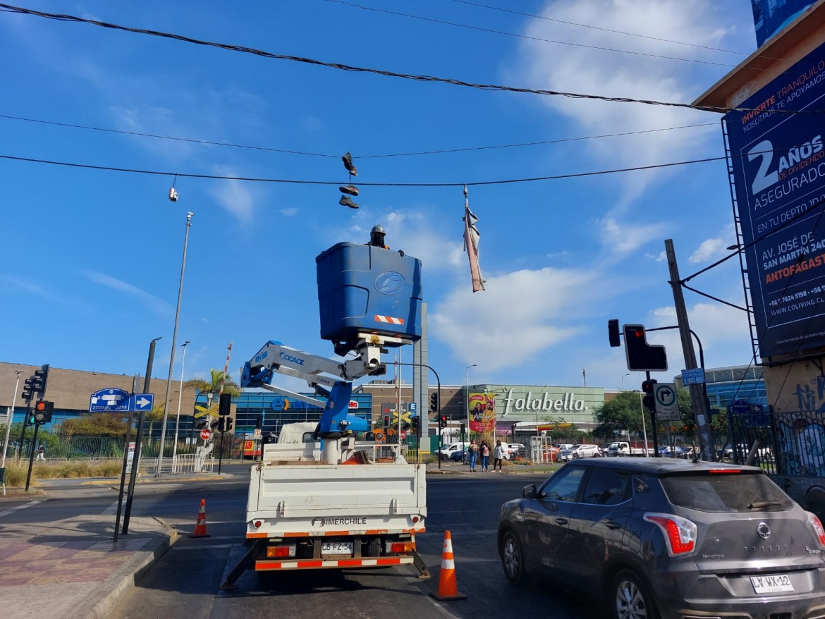Las zapatillas colgadas desde los cables de alumbrado, corresponden a códigos entre bandas delictuales para marcar territorios o la comisión de ciertos ilícitos en el sector, por este motivo y en un operativo conjunto entre la Dirección de Seguridad Pública y Alumbrado Público de la Municipalidad de Antofagasta, se realizó el retiro de éstos elementos en sectores altamente concurridos como son las intersecciones de las calles Uribe-Balmaceda y Homero Ávila-Angamos, en el marco de los procedimientos que realiza el municipio para recuperar los espacios públicos ya sea que estén tomados de forma irregular o que presenten situaciones de inseguridad para los ciudadanos.